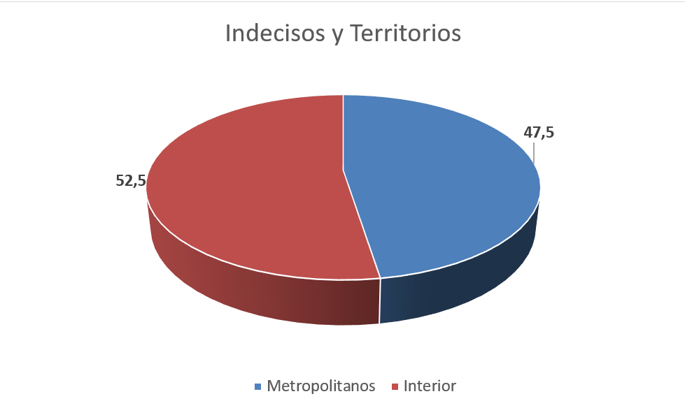 Si bien hay algunos más que votan en el interior del país la cantidad de indecisos es muy similar entre la zona metropolitana, Montevideo y Canelones, a la del resto del país. Hay dos grandes zonas del interior del país que tienen más indecisos que el resto: el centro y el litoral.