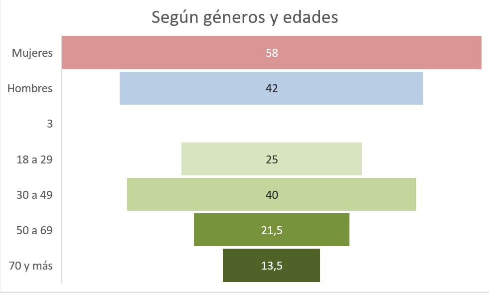La mayoría de los indecisos son mujeres, un 58%, mientras que un 42% son hombres. En tanto la mayoría de los indecisos se ubica en el grupo de electores que tiene entre 30 y 49 años, ellos representan el 40% del total de los indecisos. En el resto de las edades los mismos disminuyen, siendo los de mayor edad los que tienen la menor cantidad de indecisos.