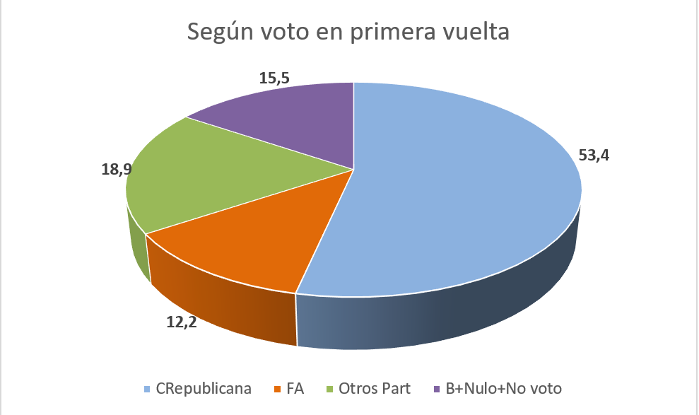 Como vemos más de la mitad dicen haber votado por alguno de los partidos que integra la Coalición Republicana, mientras que algo más del 12% manifiesta que su voto fue hacia el Frente Amplio, casi un 19% dice que votó por alguno de los otros partidos que no componen ninguno de estos bloques (fundamentalmente Identidad Soberana), y un grupo de algo más del 15% dice que votó en blanco, anulado o que no voto en la primera vuelta pero que sí lo haría en la segunda.