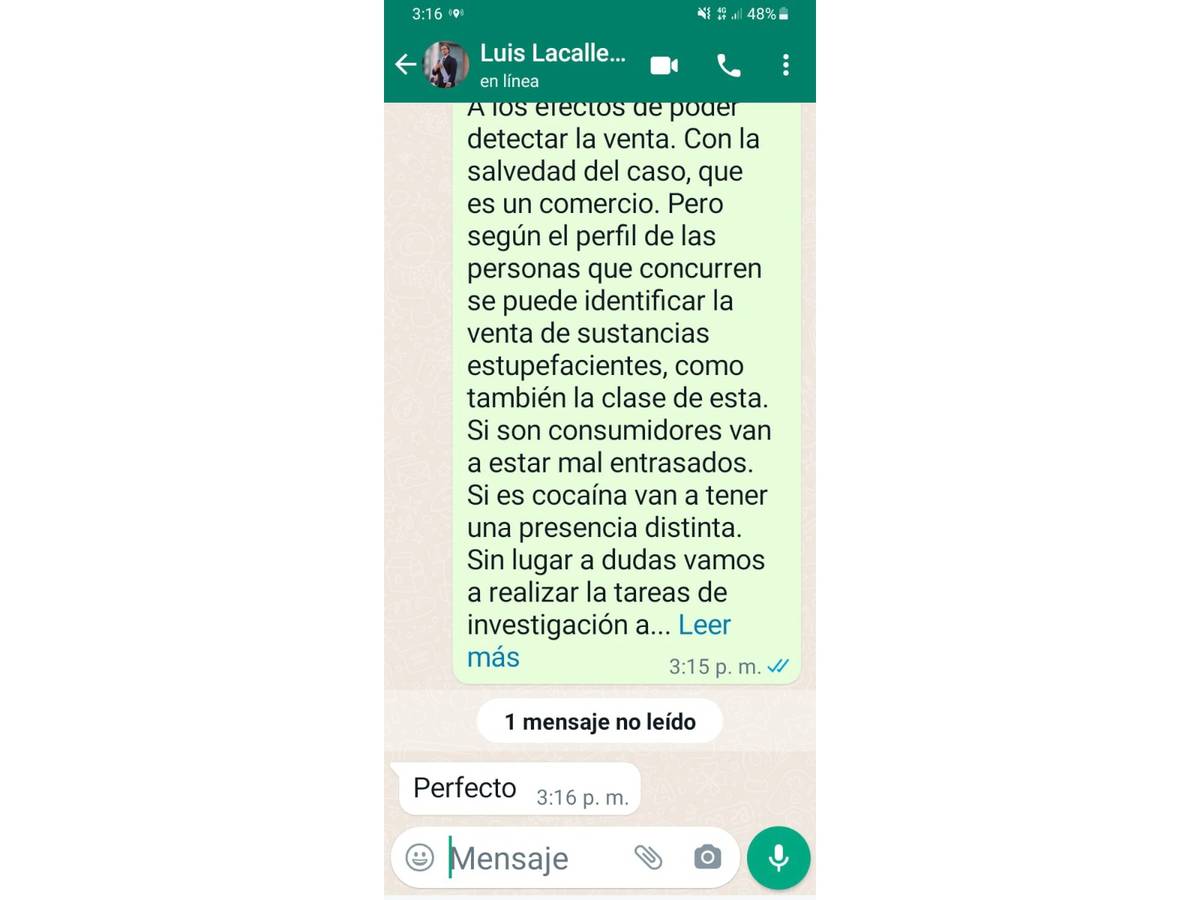 “Con la salvedad del caso, porque es un comercio, pero según el perfil de las personas que concurren se puede identificar la venta de sustancias estupefacientes, como también la clase de esta. Si son consumidores van a estar mal entrazados. Si es cocaína van a tener una presencia distinta. Sin lugar a dudas, vamos a realizar las tareas de investigación atinentes a una boca de venta de estupefacientes, sin ningún tipo de excepcionalidad”, detalló el policía. “Bien, entendido. Desde ya muchas gracias y a la orden”, replicó Astesiano.
