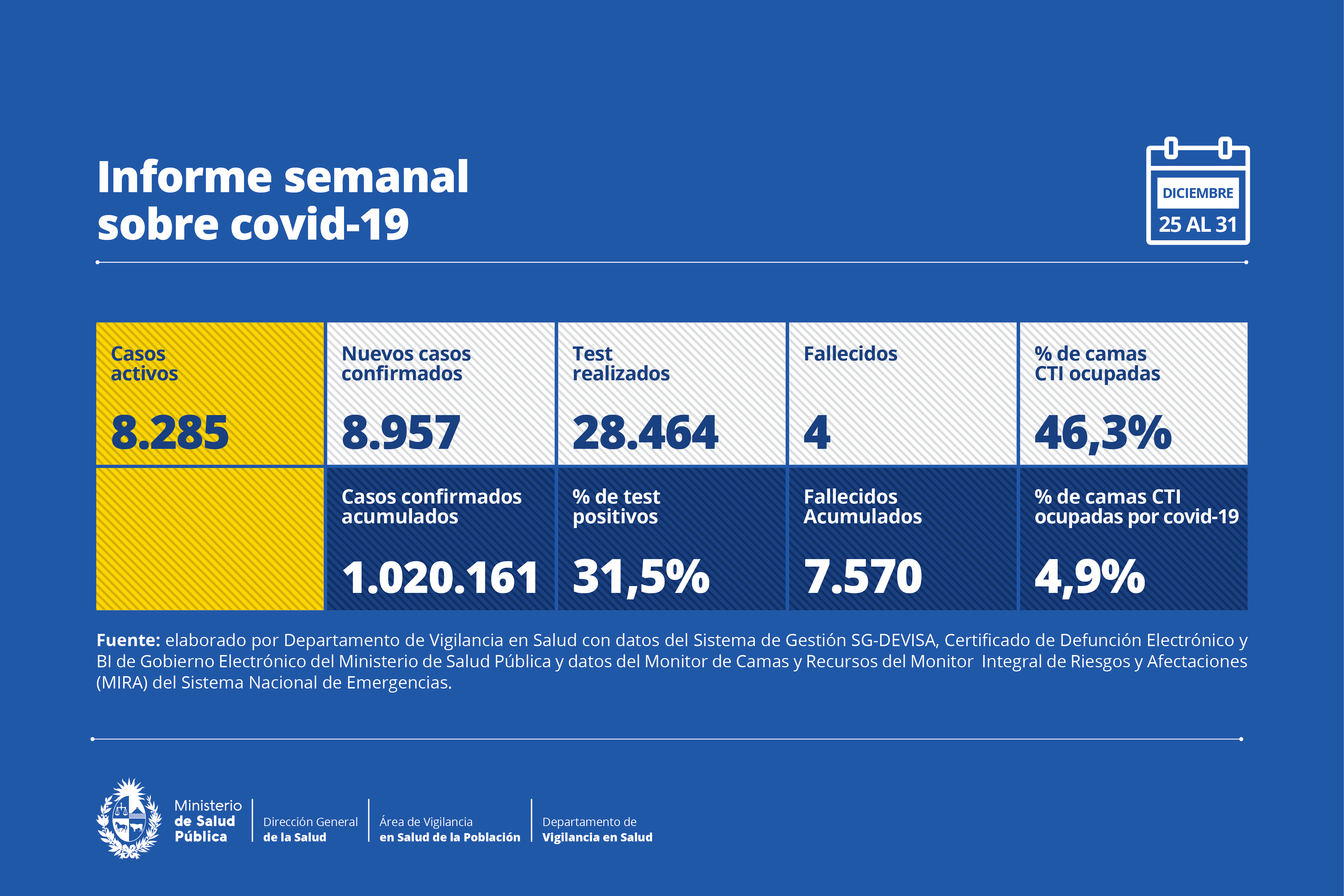 Según el último reporte del Ministerio de Salud Pública, en la semana comprendida entre el 25 y 31 de diciembre se registraron 8.957 casos nuevos de Covid-19 y cuatro fallecidos.