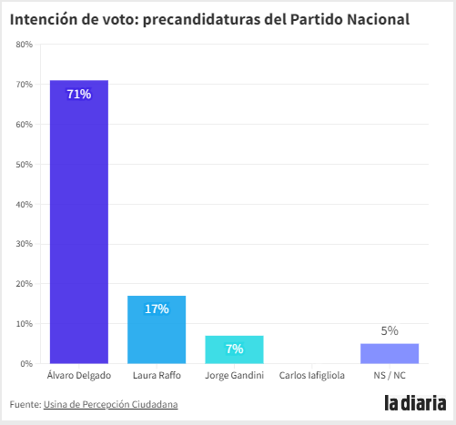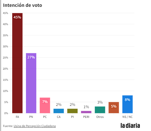 En cuanto a la intención de voto, según la Usina el Frente Amplio (FA) recibiría el 45% de los votos y el Partido Nacional (PN) el 27%, lo que los convierte en los partidos con mayor intención de voto. El 7% votaría al Partido Colorado, el 2% a Cabildo Abierto y el 2% al Partido Independiente. En tanto, un 12% de los encuestados respondió que votará en blanco o anulado.