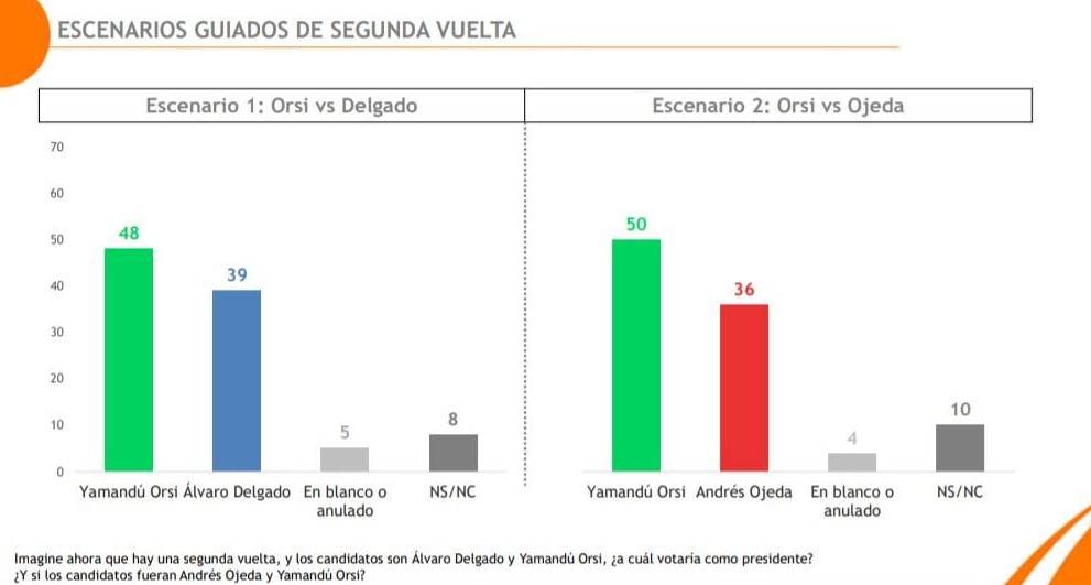 En caso de que el balotaje fuese entre Orsi y el colorado Andrés Ojeda, el primero obtendría 50% de los votos y el colorado 36%. Por otra parte, 4% votaría en blanco o anulado y 10% no sabe o no contesta.