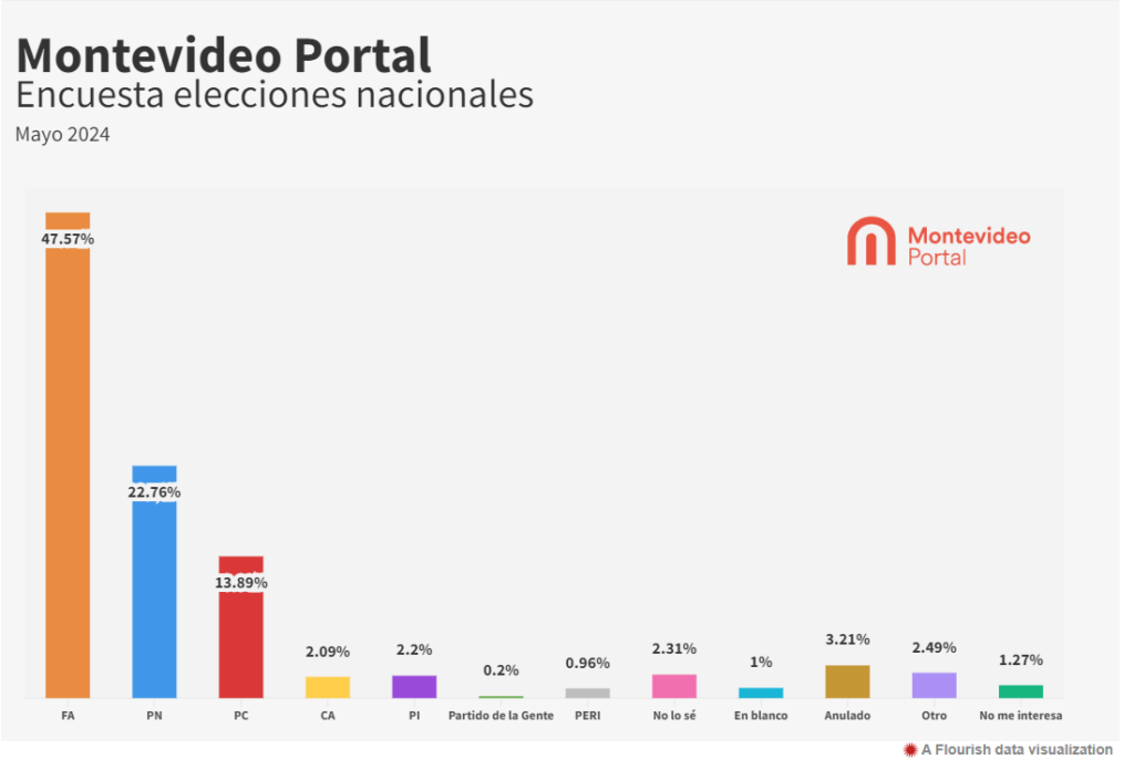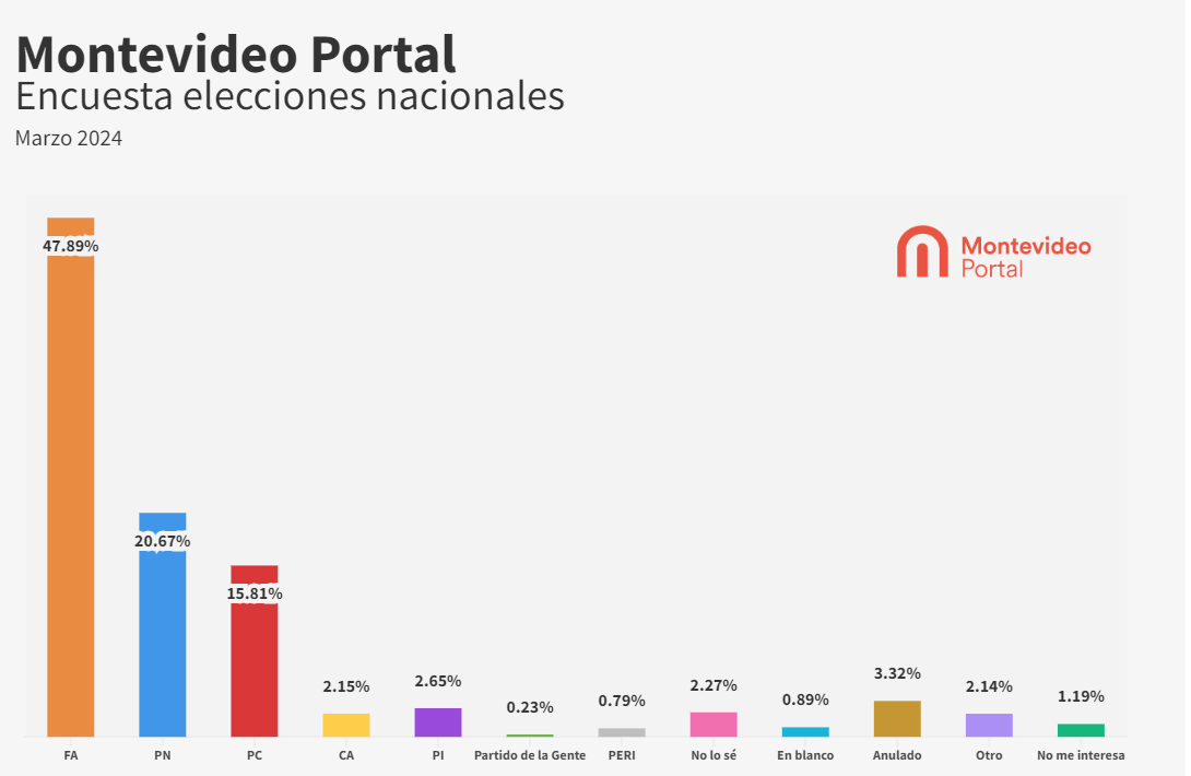 El guarismo se sitúa apenas por debajo del obtenido en la encuesta que Montevideo Portal planteó en marzo con la misma pregunta. En esa ocasión, el porcentaje alcanzado por el FA era de 47,89%.