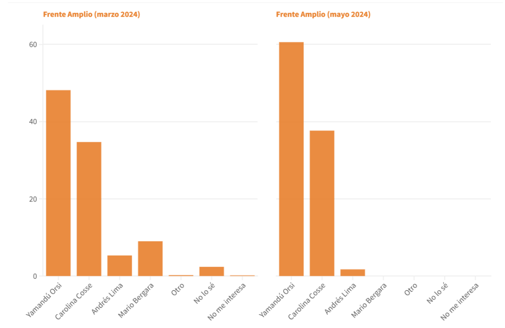 En filas frenteamplistas continúa el liderazgo de Yamandú Orsi estiro distancia respecto a Carolina Cosse. Si bien ambos crecieron en su intención de voto, el repunte del primero resulta desequilibrante. El exintendente canario tenía un 48,16% en marzo más de doce puntos, hasta llegar a 60,60%.