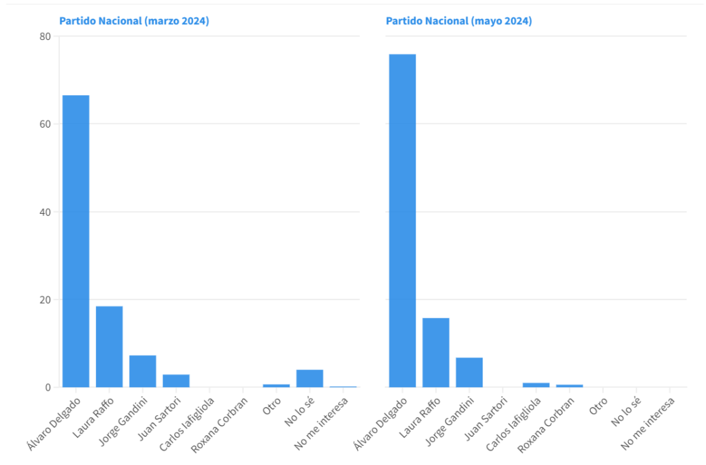 Laura Raffo, la segunda en la puja nacionalista, perdió pie y bajó de 18,46% en marzo a 15.78 en mayo. Similar suerte corrió el wilsonista Jorge Gandini, que bajó de 7,27%. a 6.75 %