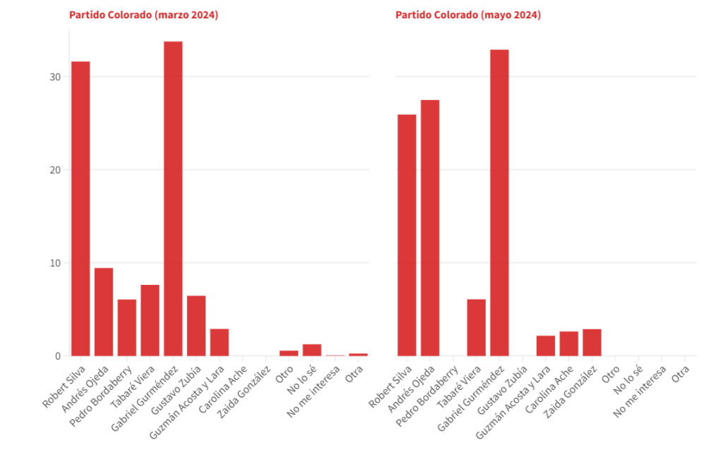 En el Partido Colorado, cuya interna es la más nutrida de la actual campaña, Gabriel Gurméndez mantiene el primer lugar con cifras muy similares a las de marzo. Entonces recibió el 33,75% y ahora acumula 32.87%.