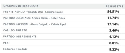 El portal https://www.uruguaysi.uy, realizó una encuesta sobre la intención de voto en las elecciones nacionales de octubre del 2024. No se trata de una encuesta con una muestra seleccionada, sino un panel de personas interpeladas por las redes.
