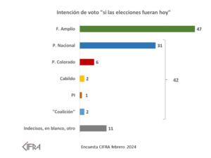 Este martes, la empresa Cifra dio a conocer en Canal 12 una encuesta en la cual afirma que si las elecciones presidenciales fueran hoy, el Frente Amplio ganaría con un 47% por encima de la Coalición gobernante con un 42%.