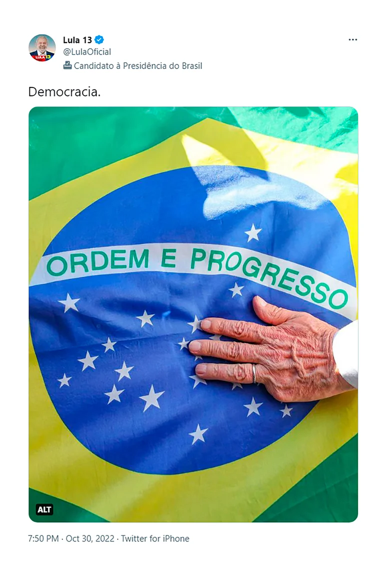 Minutos después de confirmarse la victoria, el líder del Partido de los Trabajadores (PT) utilizó sus redes sociales para publicar la palabra “Democracia”, junto a una foto en la que se ve su mano y la bandera de Brasil