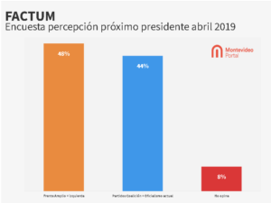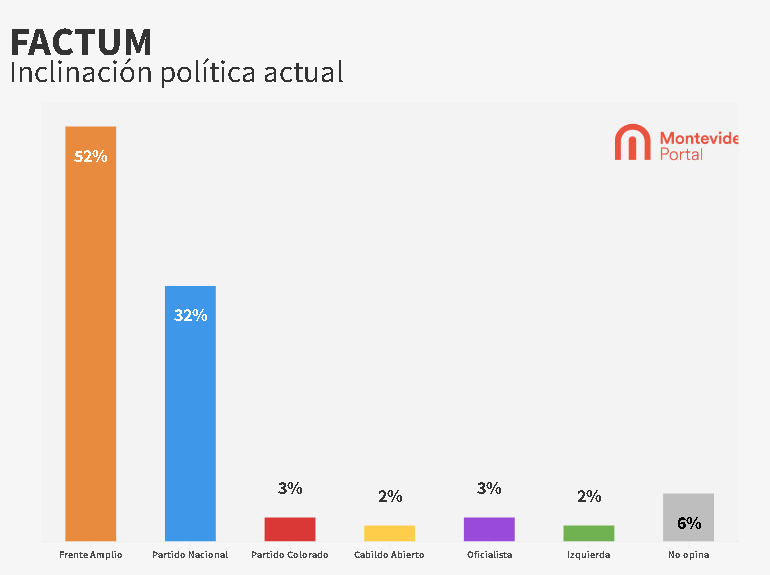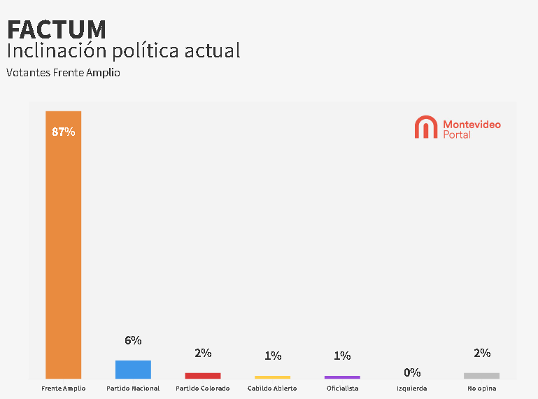 En el caso de los que prefieren la coalición de izquierda, 87% dijo que el próximo será del FA; el 6% opinó que será del Partido Nacional y el 2% del Partido Colorado. El resto de las opciones, Cabildo Abierto, oficialista, obtuvieron 1% de las preferencias.