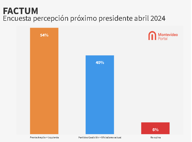 En resumen, la encuesta arrojó que un 54% de los encuestados considera que el próximo presidente será del Frente Amplio o de izquierda, mientras que un 40% opina que será de algunos de los partidos de la actual coalición de gobierno (oficialismo).