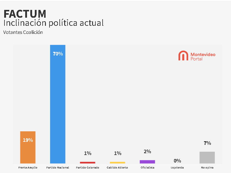 Con respecto a los votantes de los partidos de la coalición multicolor, el 70% dijo que será blanco el próximo presidente; 19%, que será del FA; mientras que del Partido Colorado y Cabildo Abierto opinó el 1% a favor.